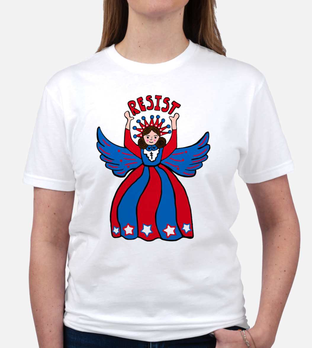 Resist Angel T-shirt spread support for decency, democracy and the resistance of the rise of authoritarianism. Printed in full color on soft, 100% ring-spun cotton for unbeatable comfort. Scroll through images for size details. These are unisex adult t-shirts and made on demand. Soft, Tagless, T-shirts! Yay 🙂 These are made on demand, so if you are wanting for March 28th No Kings event, please order ASAP.
